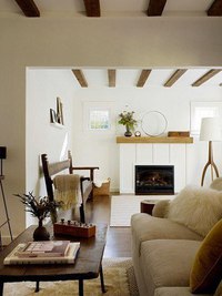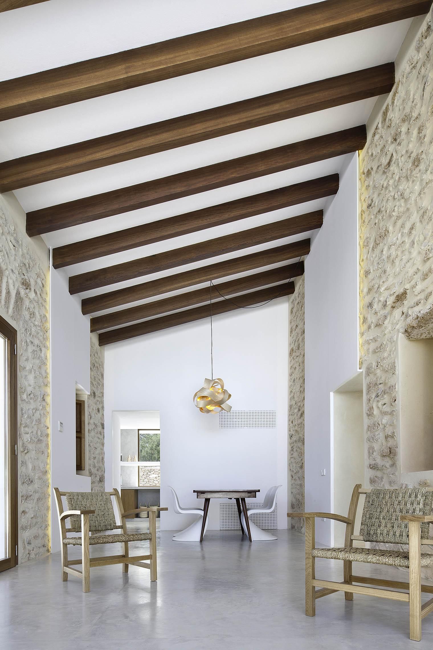 Открытые потолочные балки больше подойдут для гостинных и холлов двухэтажного дома — то есть помещений, где их использование позволяет высота.