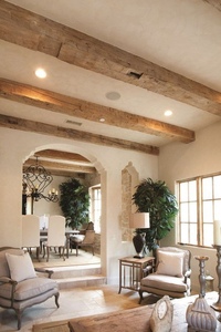В жилых помещениях отлично смотрятся параллельно расположенные балки, контрастирующие с основным цветом потолка. Беспроигрышным дизайнерским вариантом, отлично подходящим для загородных домов, станут балки из натурального дерева в тон с потолком, чудесным дополнением станут и другие предметы интерьера под дерево.