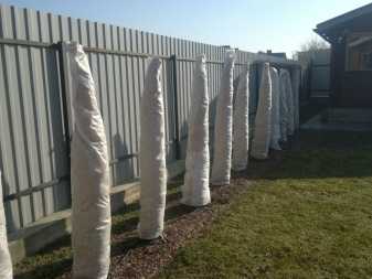 - Крону более рослых молодых и взрослых деревцев обматывают плотной бумагой, лутрасилом или спанбондом, которые закрепляют веревкой или проволокой. Либо можно просто обмотать только одной бечевкой.