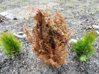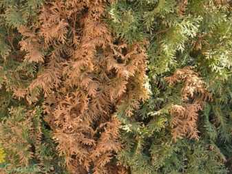 Часто после зимы кустарники желтеют вследствие неправильного ухода. Если неопытный садовод слишком рано раскроет тую после зимовки, то она может получить солнечные ожоги, после чего погибнет. Чтобы этого не допустить, после снятия укрывного материала рядом с туей нужно установить специальные щиты, затеняющие растение.