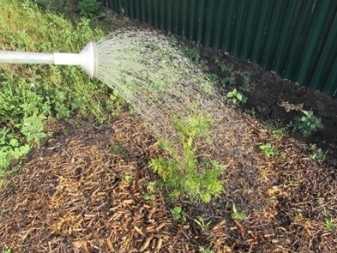 - В первый месяц после посадки саженцы поливают один раз в неделю, выливая под каждый кустик от десяти до пятидесяти литров воды. Объем воды зависит от размера растения. Если летом долго не было дождей, посадкам можно устроить душ, чтобы смыть с хвои пыль. В последующем поливы могут быть более редкими, но регулярными, чтобы не пересыхала поверхностная корневая система растения.