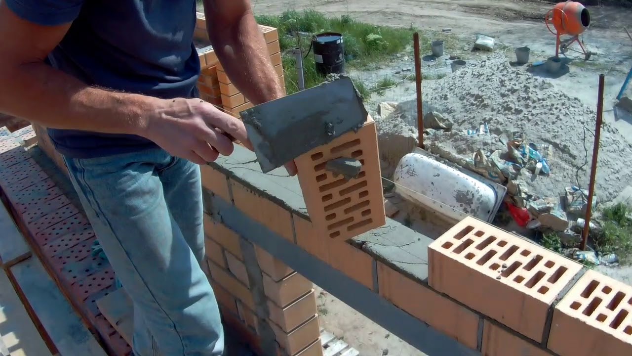 Когда углы выедены, приступают к стенам, по ряду натягивают нитку и ориентируясь на нее, аккуратно выкладывают ряд, убирая раствор после укладки каждого кирпича. Ряд всегда необходимо перепроверить при помощи нитки и длинного уровня.