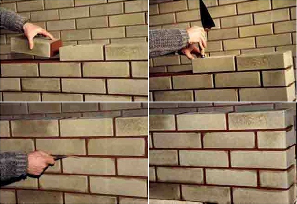 Непосредственно перед работой партия кирпичей замачивается, чтобы они не тянули влагу из раствора. Затем на кирпич наносится слоем в 1,5-2 см раствор так, чтобы он не доходил до края примерно 1 см, чаще всего для этого используют шаблон из квадратного прута 10*10 мм. Точным движением кирпич укладывается на предыдущий ряд или цоколь и слегка притирается.