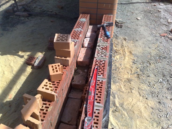 - Начните укладывать кирпичи на ровную поверхность (при необходимости установите временную прямую кромку с небольшим количеством обрезков / древесины).