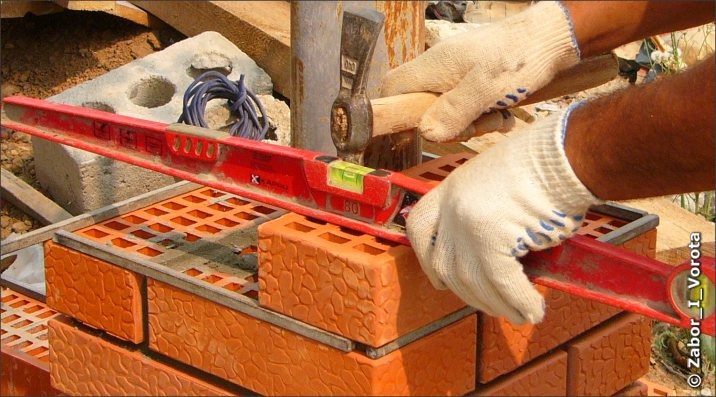 Для упрощения процедуры выравнивания углов, используют прямоугольный прут, который при помощи уровня устанавливают на угол и подгоняют кирпич под него, перепроверяя все уровнем.