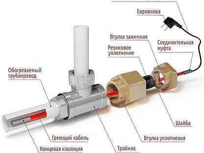 Укладываются провода в несколько параллельных рядов или по спирали. Крепёж производят металлической сеткой или липкой лентой. Чтобы повысить эффективность, и снизить энергозатраты рекомендуется дополнительно оборудовать систему теплоизоляцией с помощью алюминиевой фольги. Методика монтажа в каждом конкретном случае разная и зависит от конструкции водопровода и используемого материала, поэтому для получения наилучшей эффективности доверяйте установку системы специалистам; - Монтаж провода внутри трубы считается самым надёжным и долговечным методом утепления водопровода. Такой метод идеален для резистивных кабелей и установки новой системы водоснабжения. Для выполнения работ по прокладке кабеля внутри водопровода потребуются специальные тройники, муфты и специальный инструмент для прессовки.