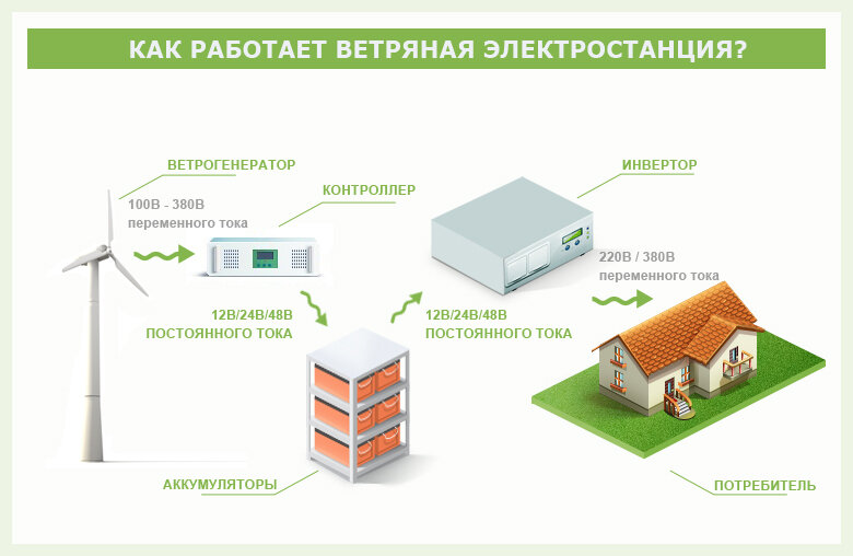 При вращении ротора создаётся трёхфазный переменный ток, затем идущий через контроллер на аккумуляторную батарею постоянный ток для его зарядки, далее инвертор, преобразующий ток в стабильно-переменный для подачи на потребители (освещение, телевизор, радиоприёмник, отопительные батареи и т.д.). Таково схематическое устройство ветряных установок.
