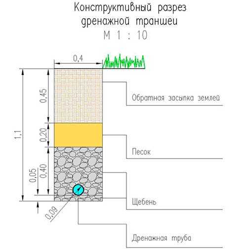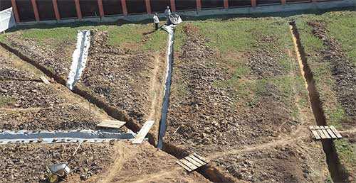 Если перепад рельефа сильно выражен, первым делом снимается слой дерна (его лучше убрать за пределы участка, заменив в дальнейшем верхний слой почвы привезенным черноземом). При необходимости обустроить дренажную систему, требуется снять весь пласт плодородной земли и насыпать слой битого кирпича и гравия толщиной около 10 см. Либо в нижней точке наклонного участка расположить траншею-водосборник, заполнив ее битым кирпичом, гравием и песком. Если выбрана дренажная система с трубами, то ниже уровня плодородного пласта земли выполняются траншеи с утрамбованным дном из щебня и песка, куда укладываются перфорированные полимерные трубы, обмотанные сеткой-фильтром, предохраняющей их от засорения.