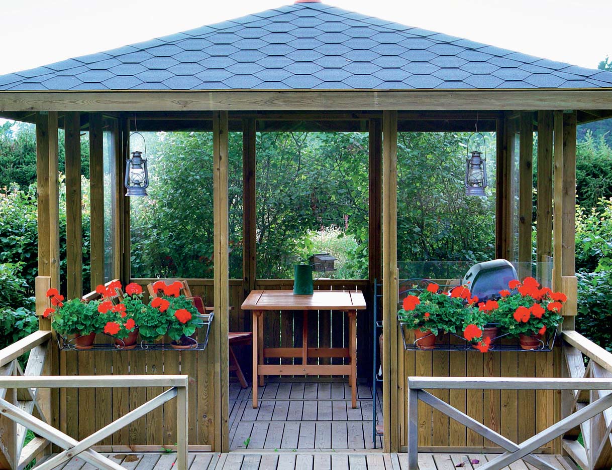 5. Установите беседку.Павильоны похожи на навесы и обычно называются навесами, но мы используем термины здесь отдельно, чтобы различать временный стиль навеса, упомянутый выше, и более постоянный вариант, о котором мы говорим здесь.Итак, павильон обычно имеет тканевый верх и угловые стойки, как выдвижной навес, но в этом нет ничего всплывающего. Павильоны представляют собой скорее полупостоянную теневую конструкцию — не совсем постоянную, поскольку обычно вы можете довольно легко перемещать или снимать их, но они требуют сборки и могут быть прикреплены к террасе, патио или земле для устойчивости и длительного использования. .