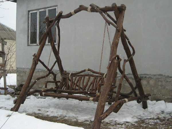 В этом примере привлекает внимание необычный способ крепления скамейки, собранной из толстых досок и веток. Она подвешена не к верхней перекладине, а к двум круглым брускам, врезанным в стойки.