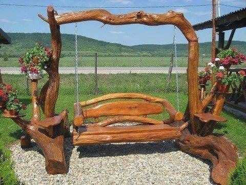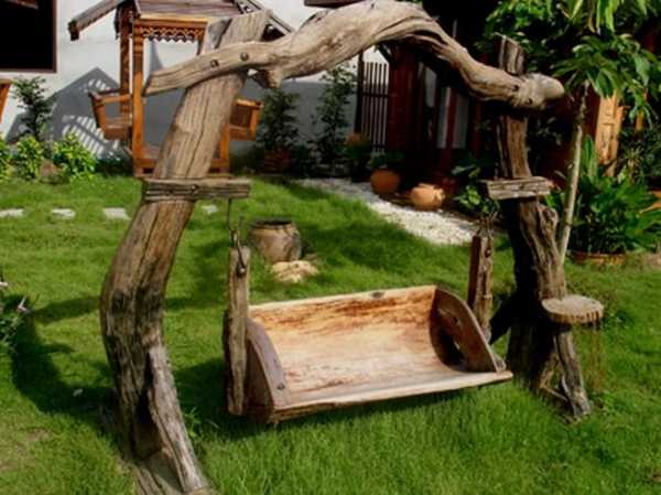 Если вы являетесь счастливым обладателем русского деревянного дома, возведенного из бруса, обязательно оцените качели в рустикальном стиле. Свои авторские модели предлагает компания GardenLand.ro стоимостью около 900 евро. Подобный садовый декор изготавливается в России семейной мастерской Eclectichome.ru с использованием природных материалов.
