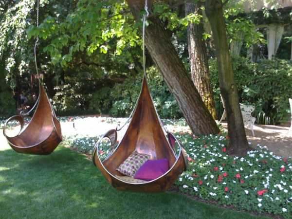 Если тянет на что-то креативное, бывают и такие оригинальные качели на двоих. Конструкция, конечно, сложная, но, как говорится, было бы желание. Зато, как маленькая беседка, очень удобно разговаривать с глазу на глаз, слегка покачиваясь.
