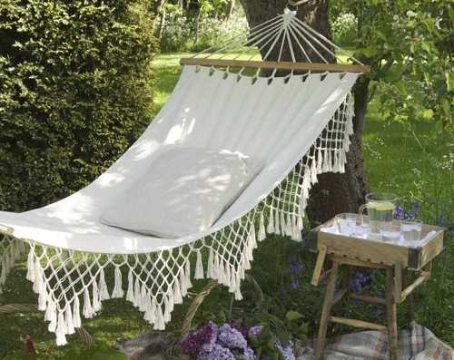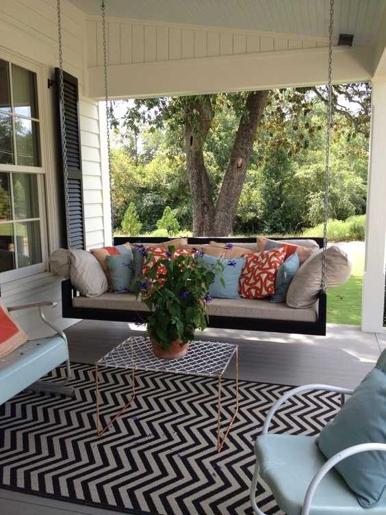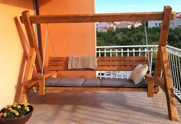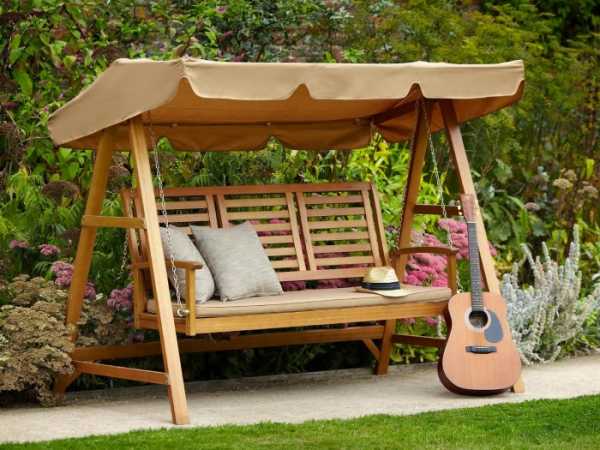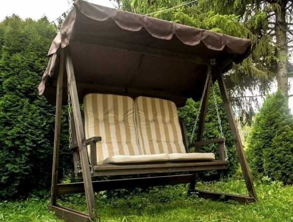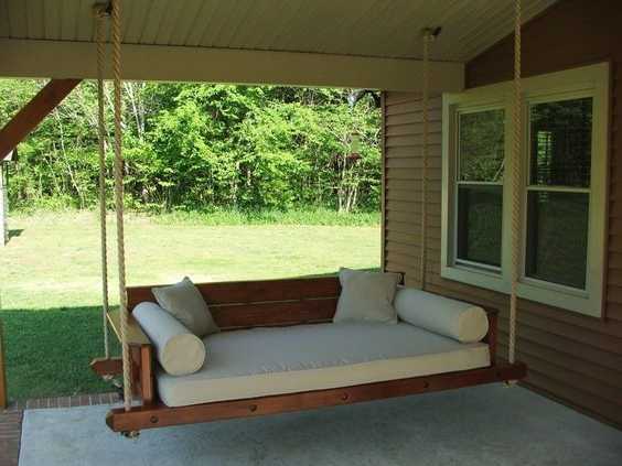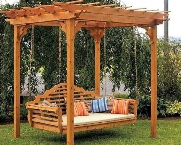Любителей понежиться на свежем воздухе не устраивает узкая скамейка. Они предпочитают широкую удобную «кровать», которая плавно раскачивается на цепях. На фото ниже мы видим пример такой конструкции.