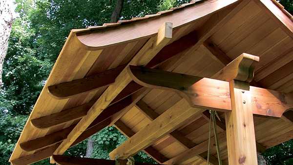 Взяв для работы пару обрезков горбыля и аккуратно обработав его, вы получите отличный результат. Добавив в конструкцию декоративные боковые затяжки и закруглив свесы крыши, вы значительно улучшите ее внешний вид.