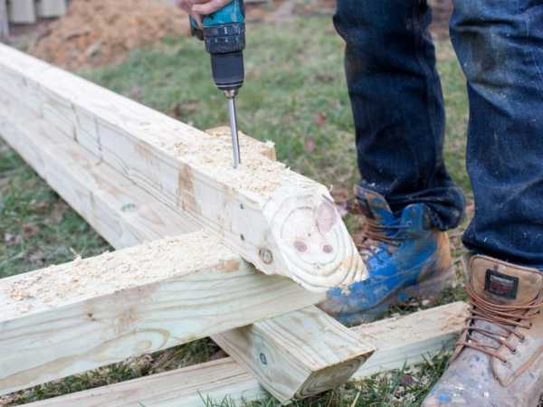 Еще один способ установки поперечины — крепить боковые стойки в виде буквы «Х». При таком варианте несущий брус отлично ложится. Его дополнительно крепят гвоздями, а стойки стягивают шпильками. Такой вариант смотрите на следующем фото.