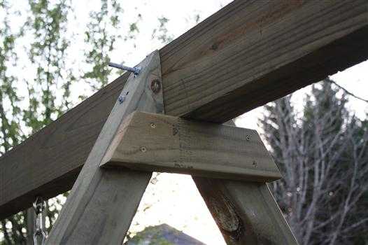 Во всех качелях такого типа — с подпиленным вверху брусьями стоек — проблемным является узел крепления поперечины, к которой цепляют потом скамью. На фото выше он решен надежно, хоть и не совсем эстетично. Вся беда в том, что эстетичные способы сложны в исполнении. И, если вам не на продажу, быстрее сделать что-то неэлегантное, но надежное. Так вот, чтобы закрепить поперечину, ниже пересечения приделан накладной брус, притянутый к стойкам шпильками. На него и ложится поперечина, которая от боковых сдвигов удерживается стойками и крепежом — гвоздями и шипильками.