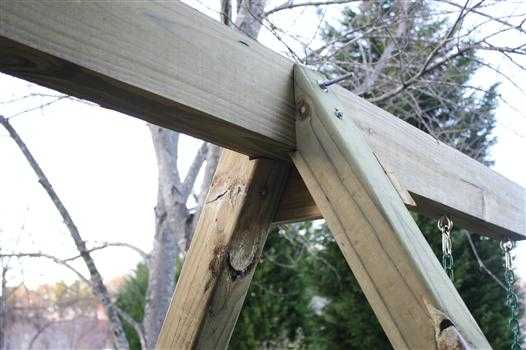 Снизу опорных ног отмечают полметра и прикладывают нижний брусок для скрепления ног одной стороны качелей. Верхний скрепляющий брусок должен располагаться ниже поперечной балки на 15 см.