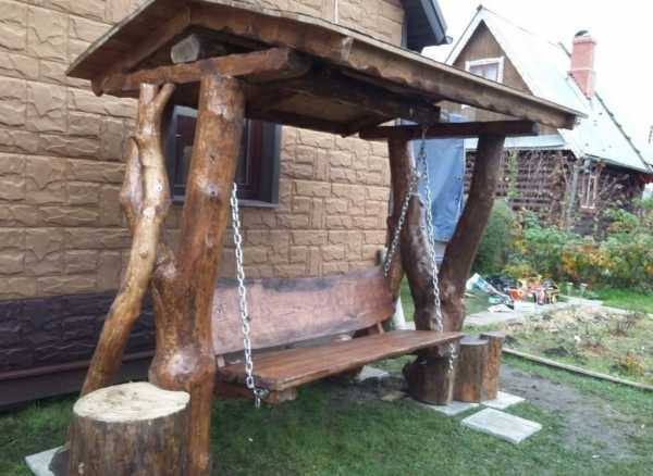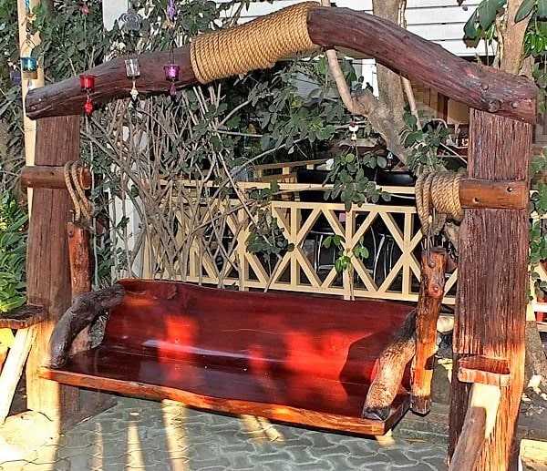 В качестве строительного материала при сооружении таких качелей применяется дикое бревно. При обработке ветви обрезаются и используются в качестве кронштейнов для цветочных подставок. Предлагаем вам оценить свои силы и соорудить такой декор самостоятельно. Как сделать качели в саду на даче из подручных материалов и своими руками фото, предлагаем посмотреть ниже.