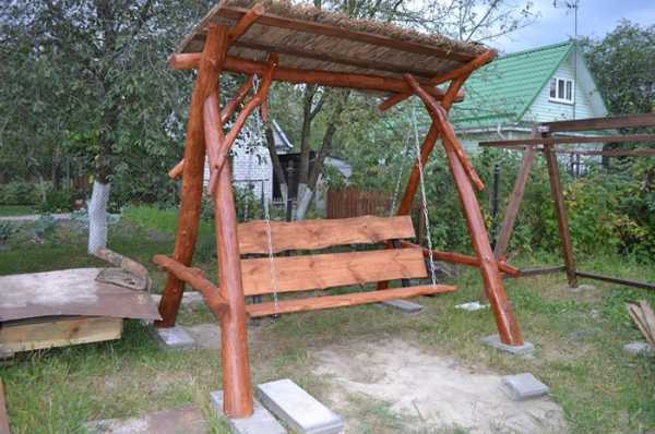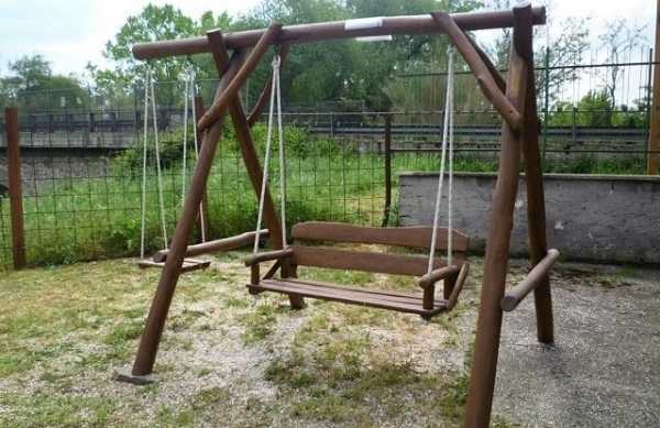 Как и большую часть надворных построек, качели чаще всего делают из дерева. Стойки и перекладину — из бруса, бревна, сиденья — из дощечек и даже из частей домашней мебели.