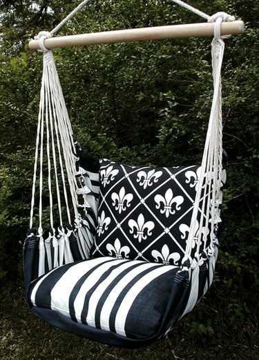 Французские качели произошли от традиционных бразильских гамаков Hammock и выполняются обычно из плотной льняной ткани или брезента, фурнитуры и толстого бельевого шнура. Форма кресла придается с помощью шнурков разной длины. Они крепятся к поперечной деревянной перекладине, которая, в свою очередь, – к надежному перекрытию террасы или перголы. Для создания основы сидения укладываются удерживающие форму подушки.