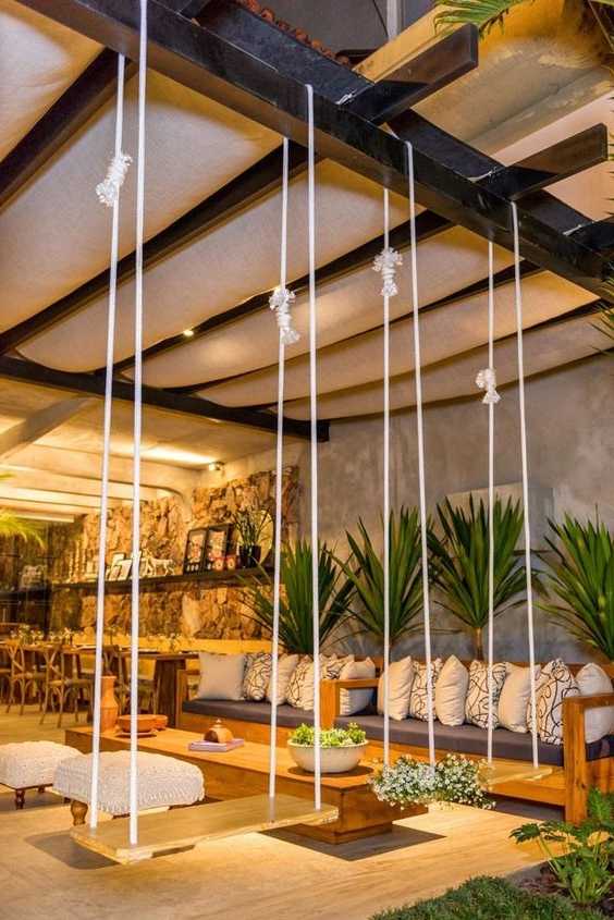 В американских коттеджах такие модели в виде лавок с текстильными подушками встречаются на открытой террасе. В итальянской Тоскане подвесные деревянные сидения очень часто устраиваются под навесом для цветов – перголой, которая отдаленно напоминают русскую беседку и нередко выполняет роль летней кухни.