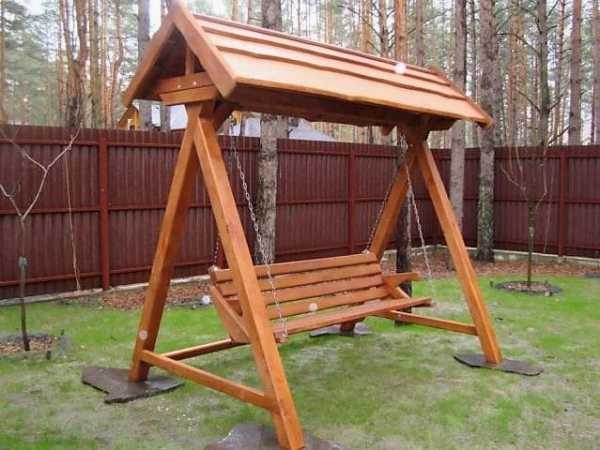 Классическая форма садовых качелей известна всем. Это две наклонные стойки, соединенные поперечной балкой, к которой подвешена скамейка. Для создания «всепогодного» варианта над сооружением делают навес. Далее открывается широкое поле для творчества и фантазии.
