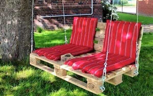 Для деревянных поддонов найдено множество интересных применений. Одно из них – удобная скамейка с высокой спинкой для качельной инсталляции. Такую сидушку с успехом можно пристроить куда угодно: и на веранду, и в беседку, и даже на ствол большого дерева.