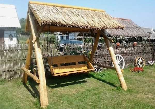 Поклонники стиля кантри могут реализовать его в конструкции самодельных качелей. Для этого достаточно накрыть бревенчатый каркас легким навесом из тростника или соломы.