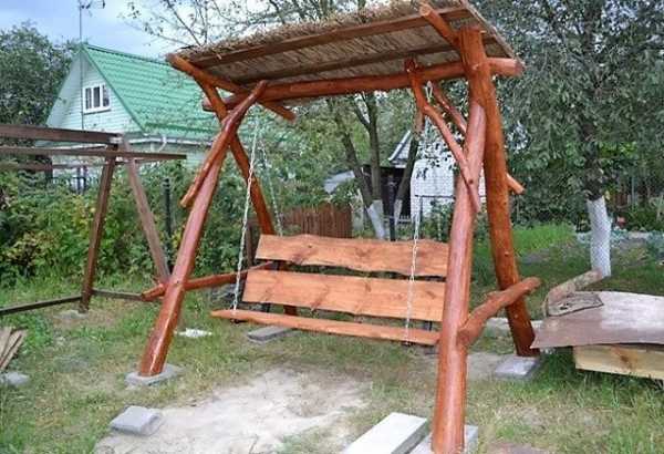 Сверху качели можно накрыть легким навесом. Для этого к верхним торцам стоек саморезами прикручивают две толстые ветки. К ним крепят несколько досок и покрывают их шифером, тростником или металлочерепицей.