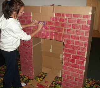 Скрепить их при помощи скотча и клея таким образом, чтобы получился камин, и приклеить сверху каминную полку.Угловой камин из одной большой коробки делается ничуть не сложнее. Просто надо отрезать заднюю стенку, а боковины скрепить под углом. На передней стенке вырезать топку, а дальше всё так же, только каминная полка тоже будет треугольная.
