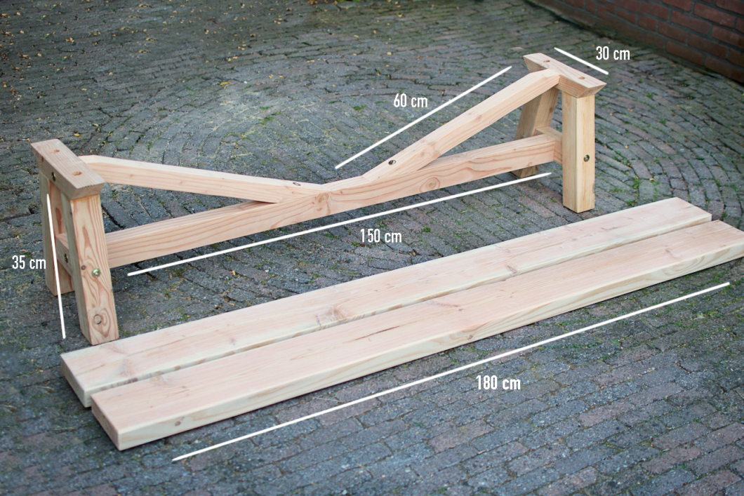 - Правильный угол наклона задаём своими руками длинным задним ножкам лавки. Они ещё играют роль каркаса всей конструкции. Наносим разметку на две деревянные заготовки с длиной 900 миллиметров. Сделать всё не так уж сложно.