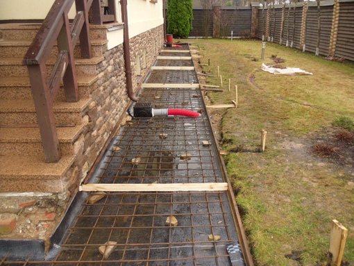 Подбетонка является выравнивающим основанием для отмостки. Выполняется из бетона марки М100-М150.