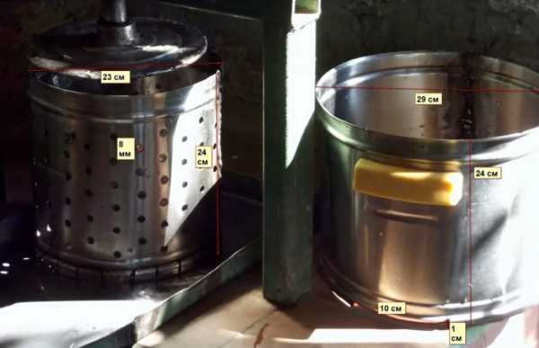 - Баки от ненужных стиральных машин разрезают и из полученного металла, используя сварочный аппарат, изготавливают две цилиндрических емкости без дна. Высота обеих емкостей должна составлять 24 см, а диаметры – 23 и 29 см.