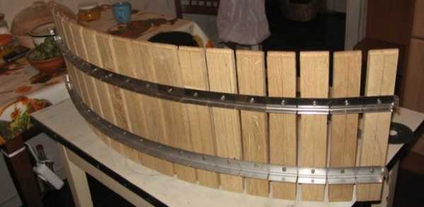 3. Корзина. Ну, корзину я видел, в моём понимании, она должна быть из дубовых планок. А где взять дуб жителю Днепропетровска? Правильно, первая ассоциация — паркет! 🙂 Вот его-то я и пустил на сиё изделие, главную часть пресса. Корзину нужно стягивать обручами. Какими? Ну конечно, нержавеющими! Почему-то у барыг на местном строительном рынке тогда не оказалось нержавеющей полосы приемлемой ширины и толщины, но зато были уголки. Ну, я и взял их. Потом ой как пожалел, так как корзина превратилась в опасный для жизни предмет… Ну об этом позже.