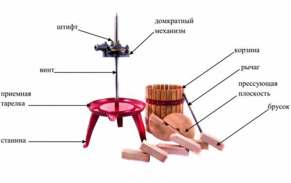 Соковыжималка, работающая по принципу пресса, представляет собой устройство, при помощи которого можно отжать сок не только из винограда, но и из других ягод и фруктов. Давилка для винограда состоит из следующих элементов: