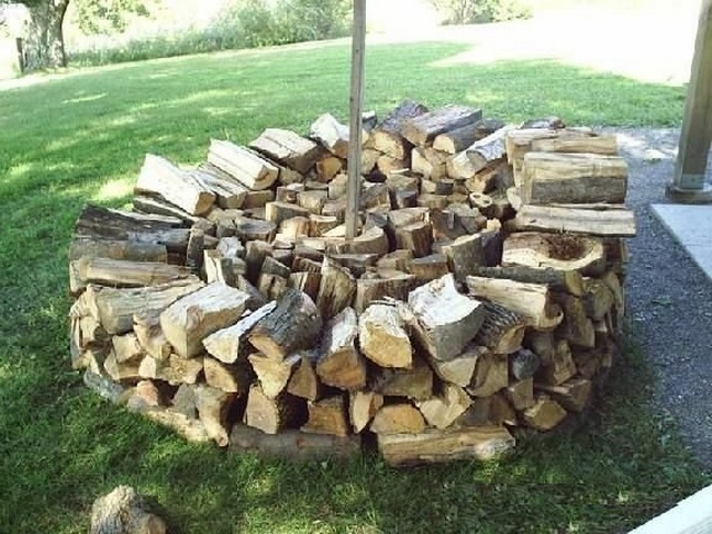 Просто сложить дрова можно только тогда, когда есть специально оборудованный навес или сарай, в который не будет попадать снег и дождь. Во всех остальных случаях топливо должно быть уложено так, чтобы оно хранилось должным образом всю зиму. Поэтому, круглая поленница будет одним из оптимальных вариантов: