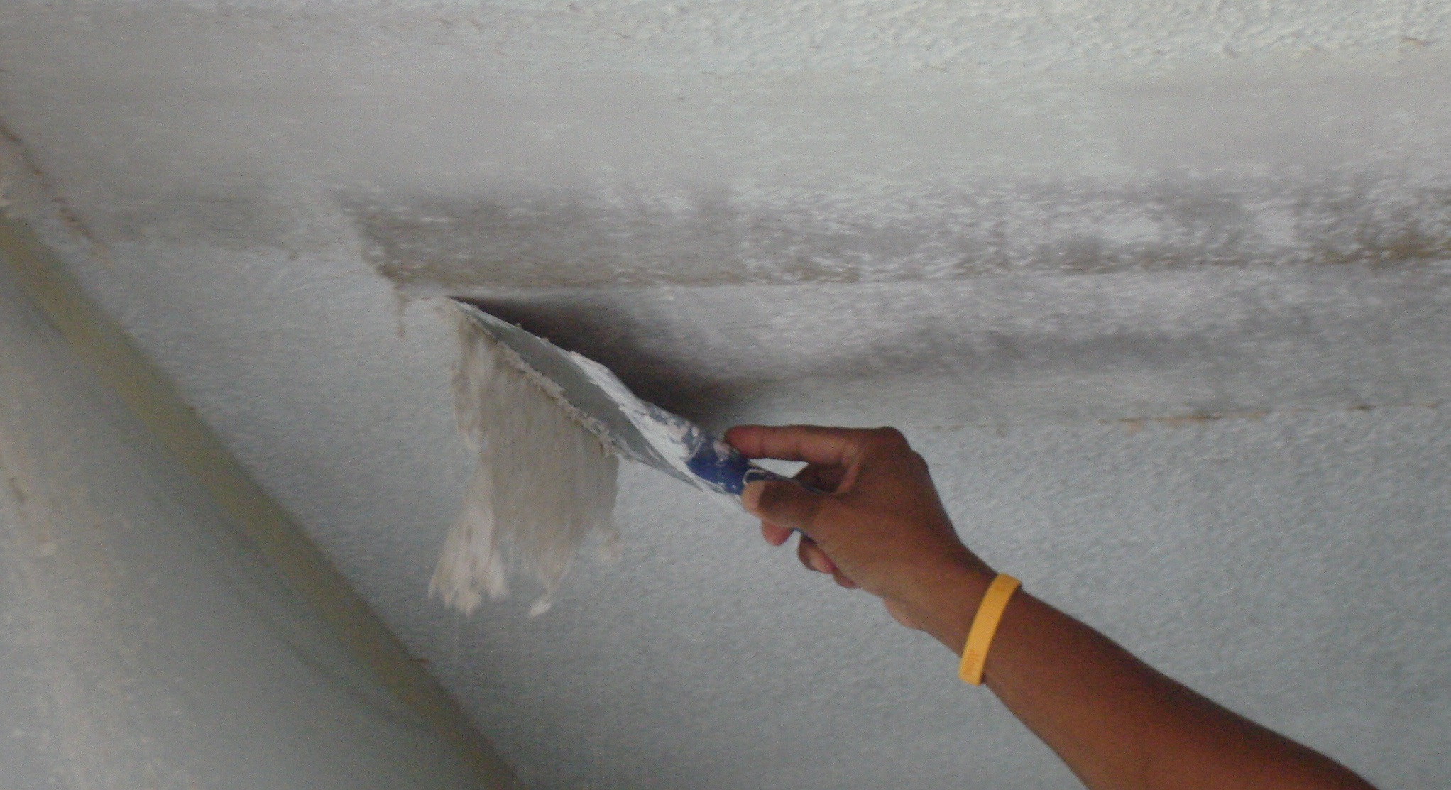 Быстро очистить потолок можно, хорошенько поработав шпателем или металлическим скребком с приделанной к нему емкостью для сбора осыпающихся загрязненений.