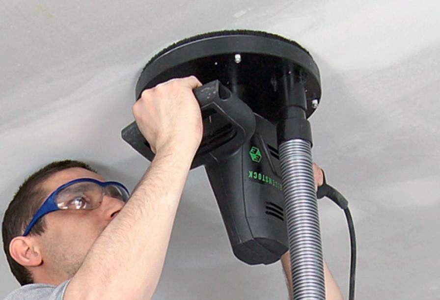 Можно чистить потолок дрелью или болгаркой с соответствующей щеткойРабота эта — продолжительная и трудоемкая, поэтому пользоваться таким методом для того, чтобы убрать побелку, вряд ли оправдывается, гораздо проще снять старое покрытие влажной смывкой.