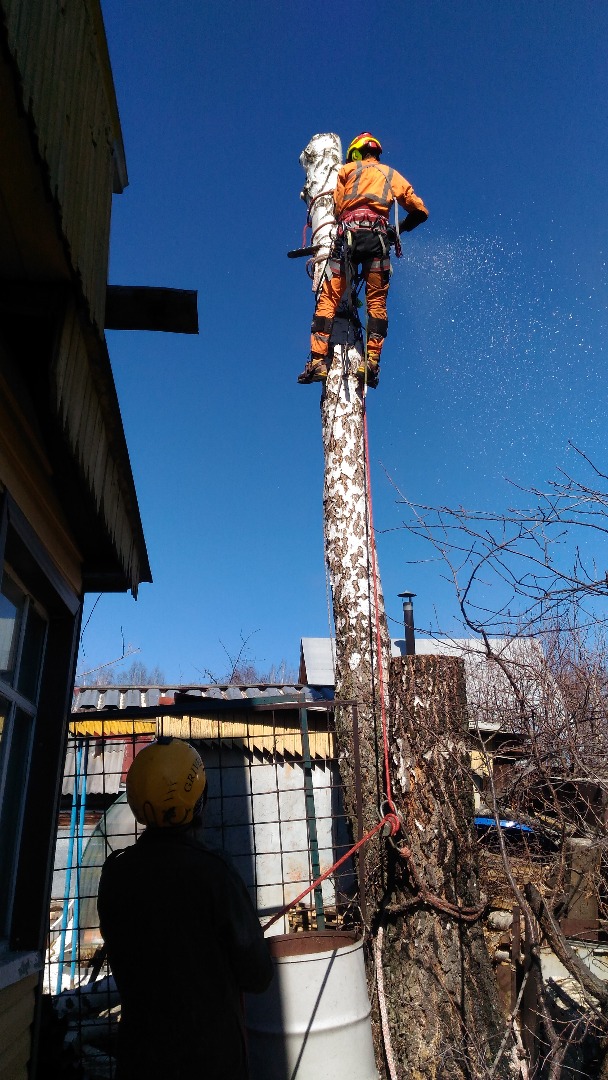 Ни в коем случае не работайте с приставной лестницы. Чтобы зафиксировать себя на высоте, обмотайте дважды вокруг ствола второй строп и проденьте ступни в петли на его концах. Работать допускается только в закрытой одежде, очках и перчатках. Голова должна быть защищена каской или хотя бы плотной шапкой. Помимо бензопилы запасите также около сотни метров прочной верёвки для оттяжек и держите под рукой лёгкий багор на случай, если ветки плотно схлестнутся.