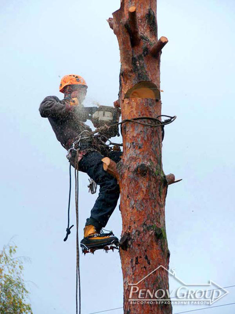 Верёвку, за которую помощник помогает контролировать падение, следует привязывать в 1–1,5 м от ствола. Ветки нужно обрезать так, чтобы оставались сучья длиной по 30–40 см, на которые можно легко накинуть страховочные стропы или опереться ногами.