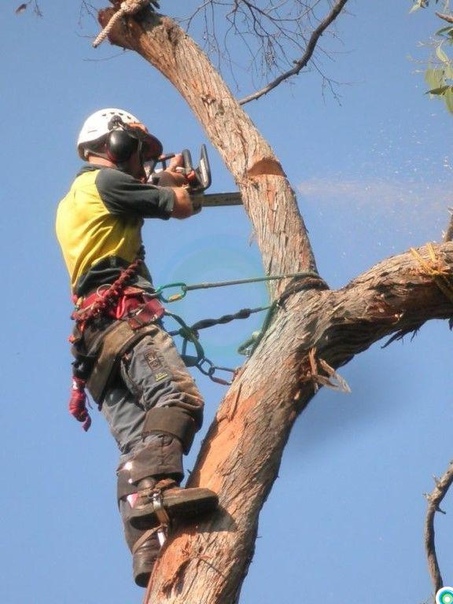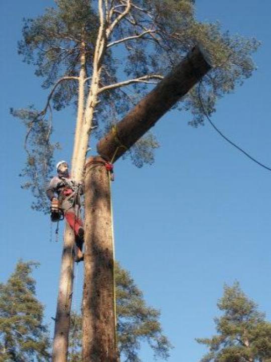 - Установка станции на верхушке дерева. Арборист, находящийся на своей рабочей станции, устанавливает систему блоков для контроля скорости и направления спуска секций дерева вплоть до земли. На этом этапе человек, находящийся у основания дерева, также подготавливает необходимое оборудование: устанавливает тяговые и направляющие веревки, готовит бензопилу и т.п.