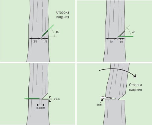 На противоположной «зарубке» стороне ствола намечается место направляющего падение подпила – оно должно быть на 20-50 мм выше нижней части клина. Далее процесс выполняется следующим образом: