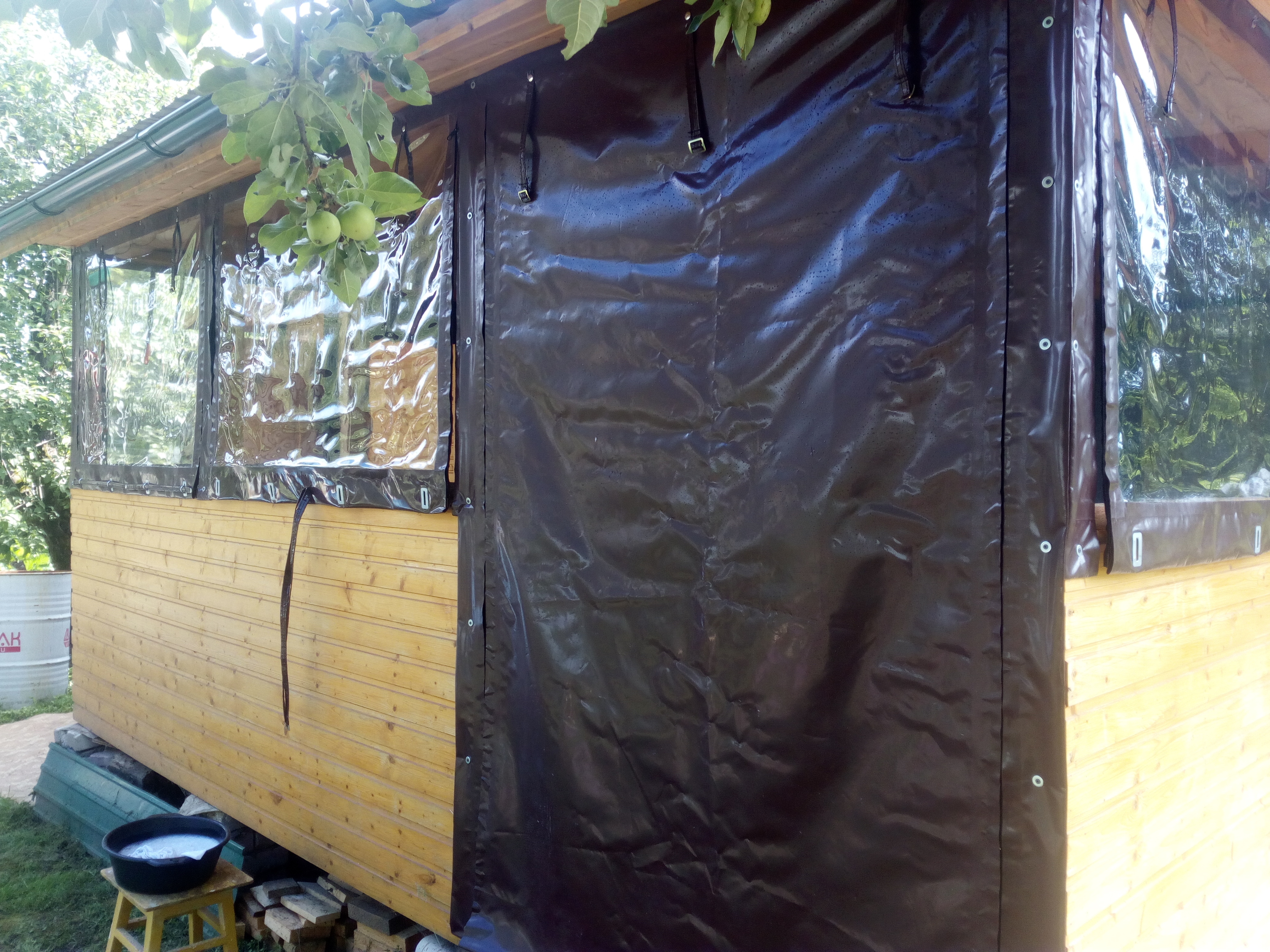 Если планируется использовать место и на морозе, то стоит помнить про светонепроницаемость полипропилена. Возможно, потребуется доводка с помощью канцелярского ножа, чтобы вырезать оконные и дверные проемы.