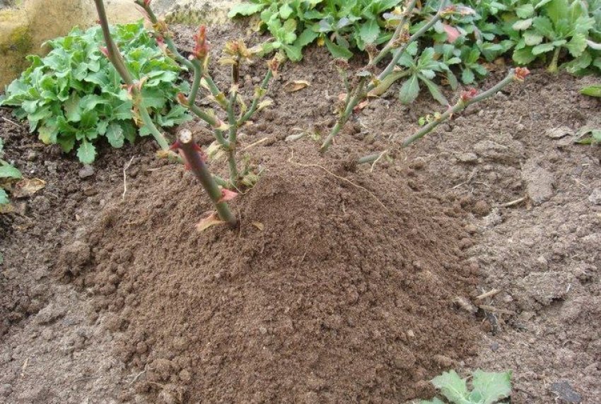 Перед тем, как укутывать розу, у нее удаляют все слабые утонченные и невызревшие ветви, срывают все листья. Зрелые ветви укорачивают до 40 сантиметров в высоту, обрабатывают трехпроцентным раствором железного купороса или однопроцентным бордоской жидкости и окучивают сухими сыпучими материалами на высоту от 15 до 20 сантиметров.