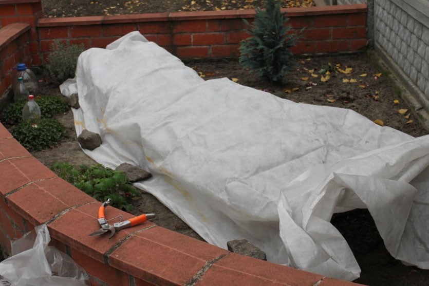 На неё укладываются пучки побегов роз, а поверх них еще слой лапника. После этого укрытие накрывают двойным слоем спанбонда или лутрасила, хорошо закрепляют по краям. Лучше использовать укрывной материал белого цвета.