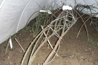 Молодые гибкие растения пригнуть проще, но достаточно взрослые придется пригибать в несколько этапов. Под штамбом со стороны, в которую будут пригибать ствол кладут чурку. Она предохранит штамб от излома. Каждый день пригибают штамб на 10-15 см и фиксируют, пока крона почти ляжет на землю. Крону, ствол и его основание у корня оборачивают укрывным материалом. Затем качественно фиксируют. Сверху укрывают лапником.