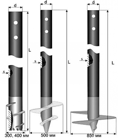 Каждая свая выглядит как металлическая труба с толстыми стенками – от 40 до 120 мм. У неё есть наконечник в виде лопасти с большой резьбой, что помогает закручивать сваи в землю и одновременно выполняет функцию опоры на грунт. Диаметр лопастей бывает разным – от 20 до 85 см.