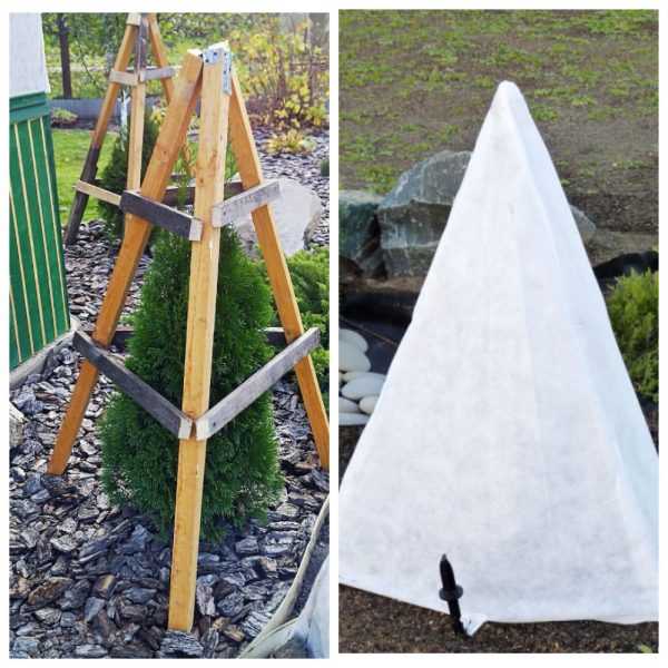 Шалашная конструкция с закреплённым наверху укрывным материалом защитит тую от морозов, ветра и солнца, и на ней не скапливается снег.