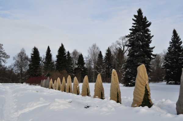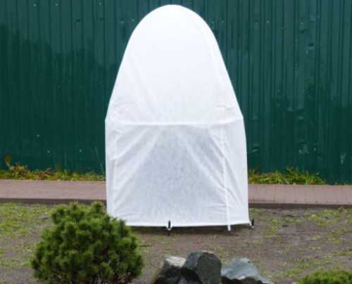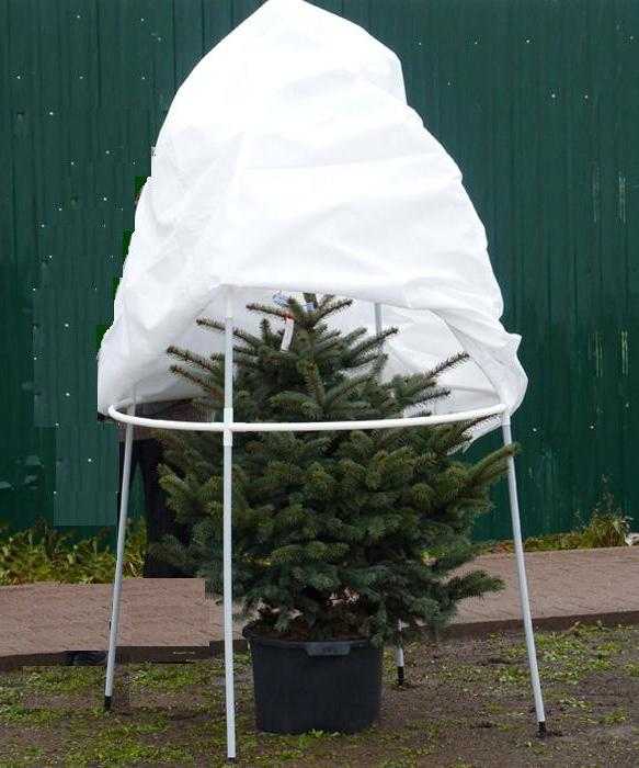 - Нетканый укрывной материал (в рулонах или в виде готовых чехлов). Важно при использовании таких материалов сделать «воздушное» укрытие, то есть не позволять ткани касаться ветвей и хвои,и тем самым обеспечить свободную циркуляцию воздуха. Для такого укрытия ставят металлический каркас, а снизу ткань не затягивают полностью, оставляя промежуток в 5–10 см для притока воздуха.