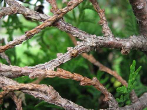 - Вредители. Сопротивляемость туи к различным вредоносным бактериям высокая, но полностью исключать заражение инфекциями нельзя. Ее регулярно осматривают на наличие налета или пятен, при обнаружении болезни проводится обработка соответствующими препаратами.